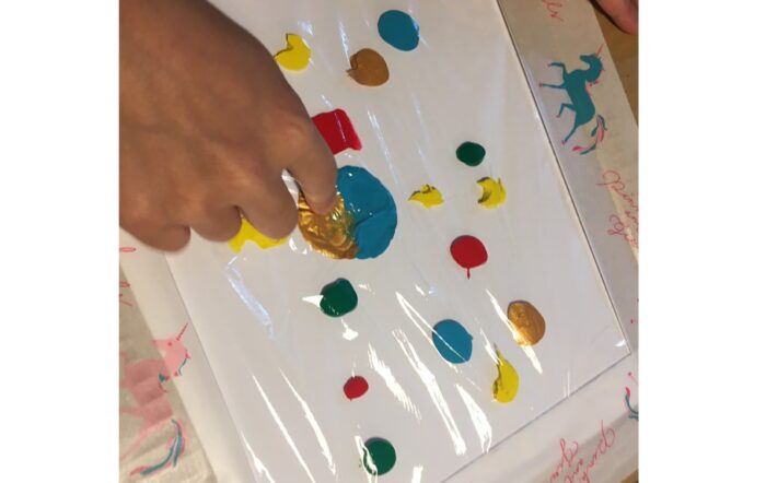 今回は「指先を使ってプッシュアート」を紹介します。 絵具はラップの上から触るので、手が汚れる心配がありません。ハイハイできるくらいの赤ちゃんから小学生まで、幅広く楽しめますよ。