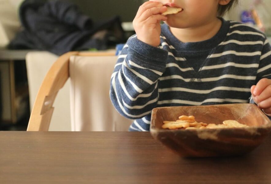 歯茎や舌、歯を使って噛み砕かないと飲み込めない大きさのまま食事を与えてみてください。たとえば野菜も細かく刻み過ぎるのではなく大きめにカットしたり、おにぎりやパンも手で持って数口かじりとらないと食べきれない大きさにしたりといった具合です。